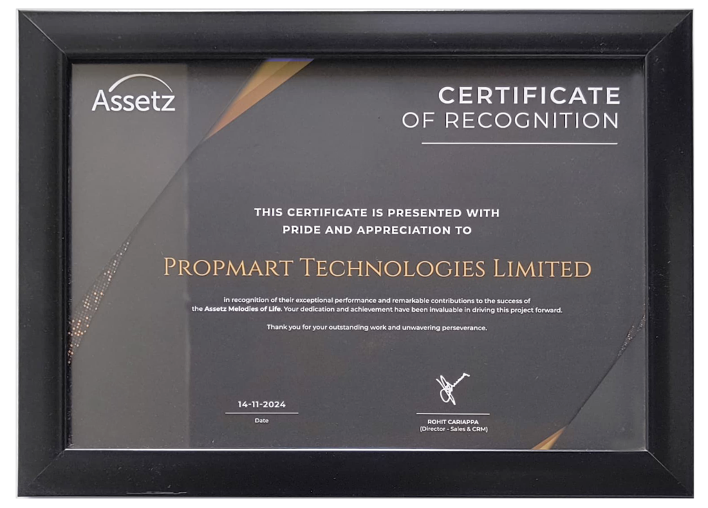 PropMart is proud to be recognized by Shriram Properties for our significant contribution towards their sales growth and project success.